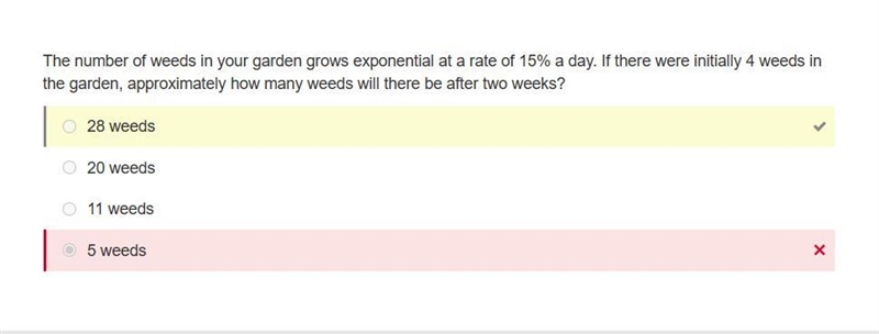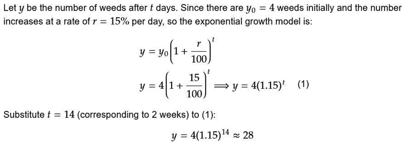 The number of weeds in your garden grows exponential at a rate of 15% a day. if there were initially 4 weeds in the garden, approximately how many weeds will there be after two …
