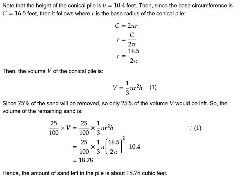 5. A conical shaped pile of sand at the beach has a base circumference of 16.5 feet and stands 10.4 feet high. The Department of Public Works is going to remove 75% of the sand.…