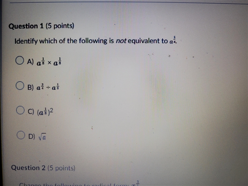 A. a^1/8 x a^1/8 = a^2/8 = a^1/4