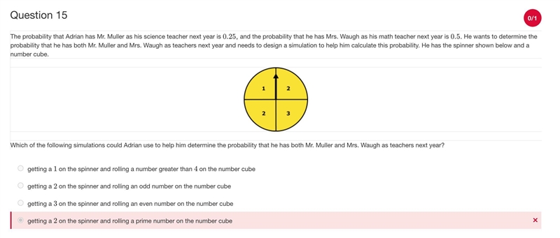 because the spinner presents three options (two 2s, a 3 and a 1), there is a 50% chance that he will spin a 2. the spinner has to be able to represent his chances of having mr. muller as his science teacher though, because there is only a 25% chance that he will spin a 1 or a 3.