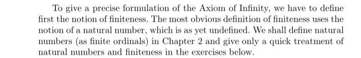 Thus, in the definition of finiteness, the notion of a natural number is used to provide a precise and rigorous characterization of what it means for a set to be finite. It allows us to establish a clear distinction between finite sets and infinite sets, which do not have a one-to-one correspondence with any subset of the natural numbers.