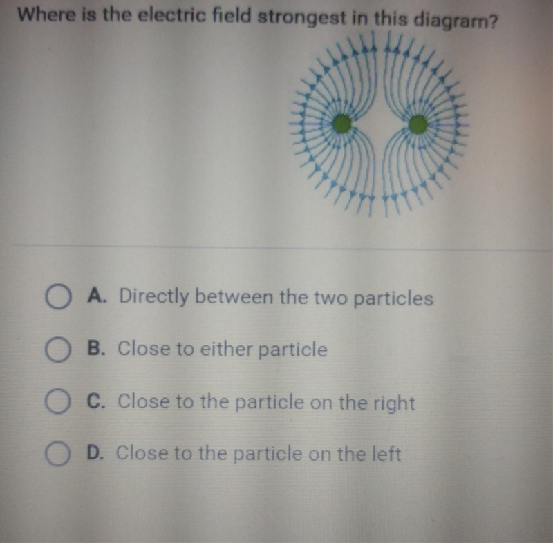 Where is the electric field strongest in this diagram? O A. Directly between the two particles B. Close to either particle C. Close to the particle on the right D. Close to the …