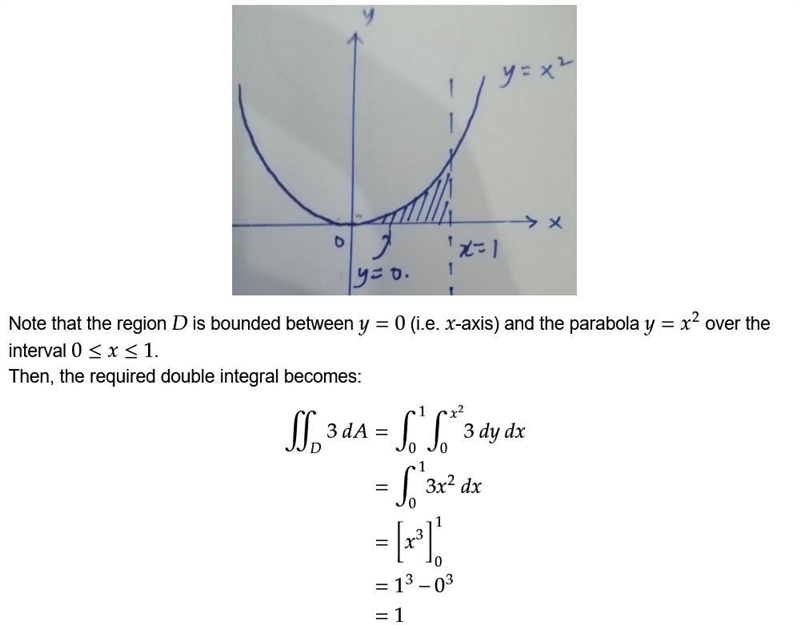 The numerical value of ∫ ∫ D 3dA (where D is the region bounded by lines y=0 and x = 1, and the parabola x² = y) is equal to ___