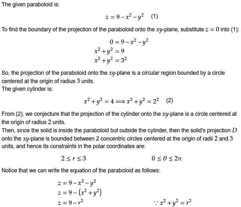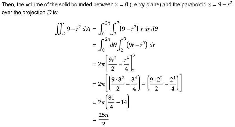Find the volume inside the paraboloid z = 9-x² - y², outside the cylinder x² + y² = 4, above-example-2