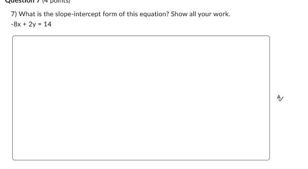 What is the slope-intercept form of this equation? Show all your work. -8x + 2y = 14 HELP FAST!!!