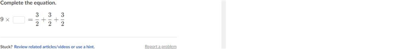 The missing symbol in the equation 9x ____ = 3/2 + 3/2 + 3/2 is the equal sign =. The equation can be simplified to 9x = 9/2, which means that x = 1/2.