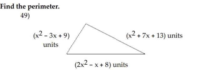 Add the lengths of the three sides: (x2−3x+9)+(x2+7x+13)+(2x2−x+8)