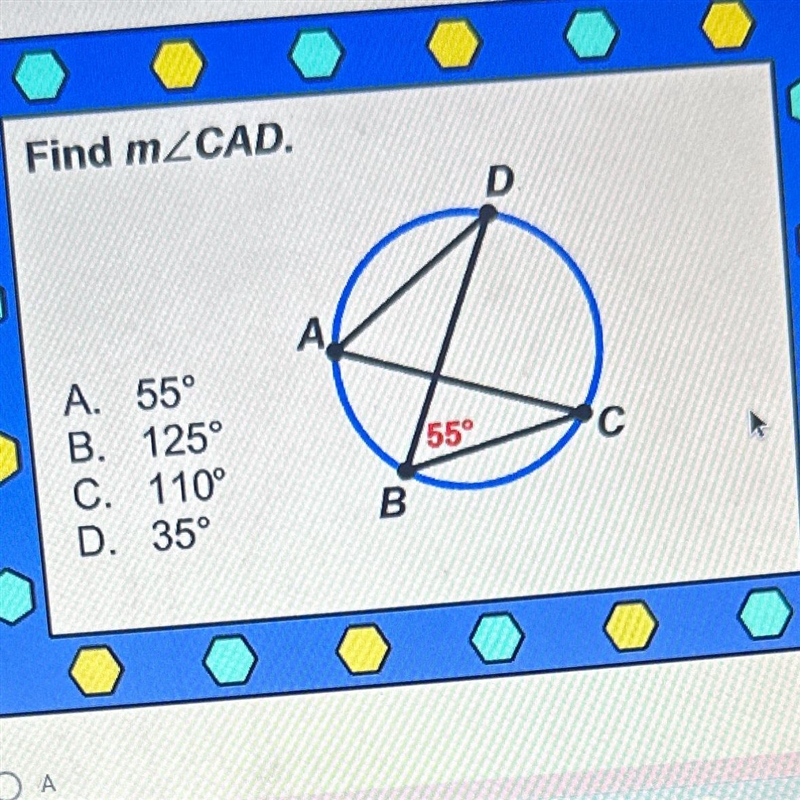 Find m/CAD. A. 55° B. 125° C. 110° D. 35° A B 55° D C