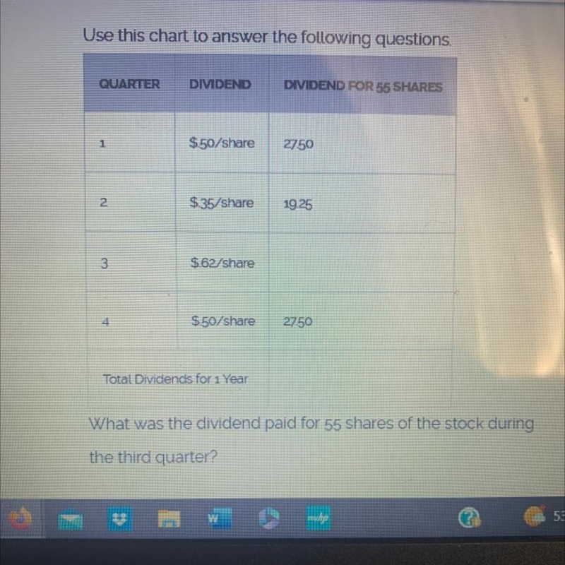 - The dividend for 55 shares during the third quarter would be 55 x $35/share = $1925