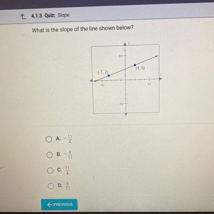 What is the slope of the line shown below? OA. -11/4 O B.-4/11 O C. 11/4 O D.4/11-example-1