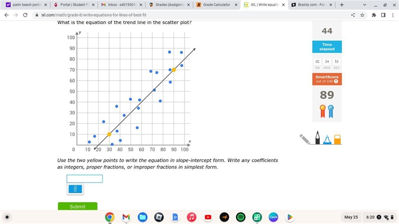 (90,70) will be x1,y2. (30,10) will be x1,y1. Put these values into the slope formula, which is y2-y1/x2-x1. 70-10/90-30. 60/60=1. The slope is 1. Now to find the slope-intercept equation, use point slope form which is y-y1=m(x-x1). y-10=1(x-30). Distribute the 1 to the terms in the parenthesis. y-10=x-30. Add 10 to both sides to eliminate 10. y-10+10=x-30+10. y=x-20.