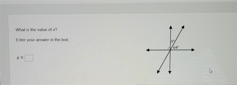 Answer: x=26 degrees. These angles are complementary angles, meaning they add up to 90 degrees. if you do 90-64, you get 26 degrees.
