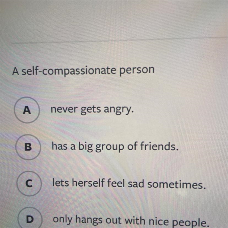 She is self-compassionate, meaning she will do good and helpful things for herself. Being sad is something that everyone experiences and is helpful for bringing out emotions and understanding them. Hope this helps