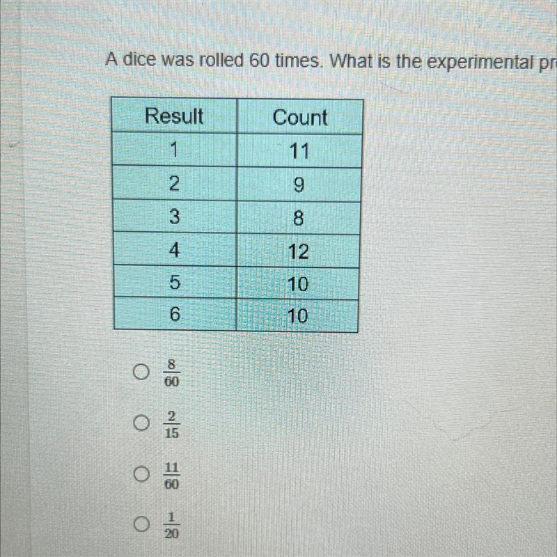 A 3 was rolled 8 times, so the results are 8/60=4/30=2/15