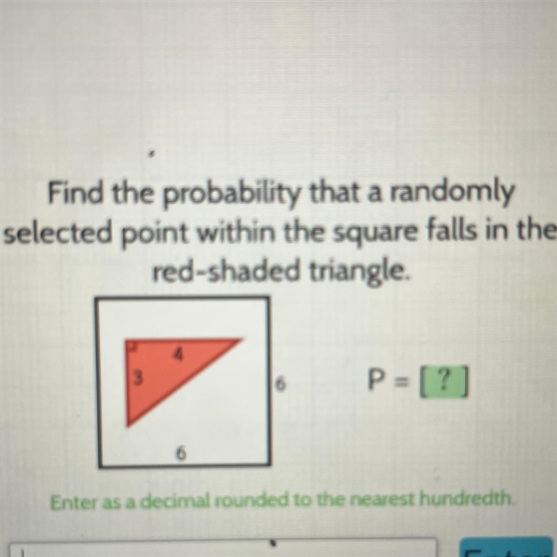 Find the probability that a randomly selected point within the square falls in the red-shaded triangle. 3 4 6 6 P = [?] Enter as a decimal rounded to the nearest hundredth.