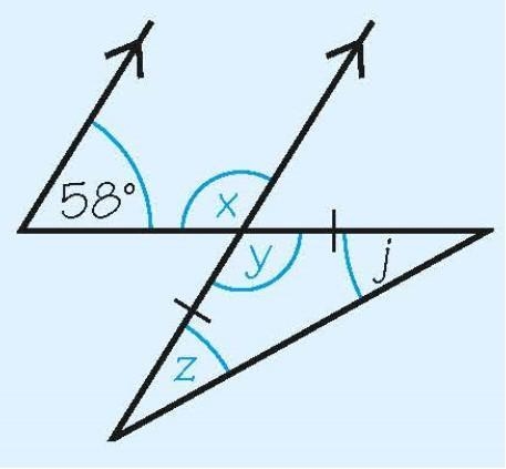 What are the base angles z & j of the equal sided triangle below? Type in the single angle only - not the sum of the two! numerical answer only