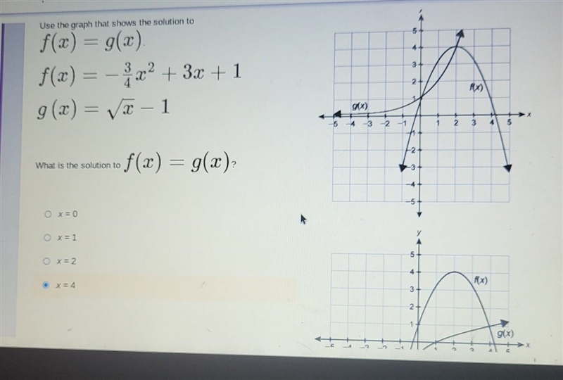 F(x)=g(x) f(x)=-¾x²+3x+1 g(x)=(sqrt x)-1 what is the solution to f(x)=g(x) 1. x=0 2. x-example-1