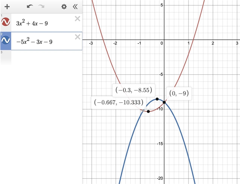 You want to know what the parabolas f(x) = 3x² +4x -9 and g(x) = -5x² -3x -9 have in common.