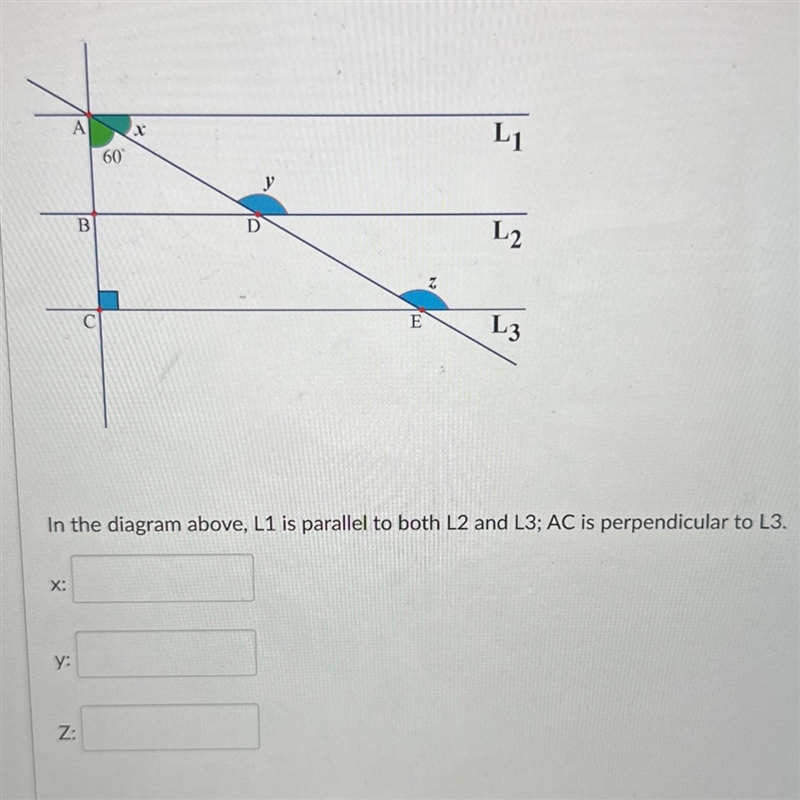 In the diagram above, L1 is parallel to both L2 and L3; AC is perpendicular to L3. Find x, y, and z.