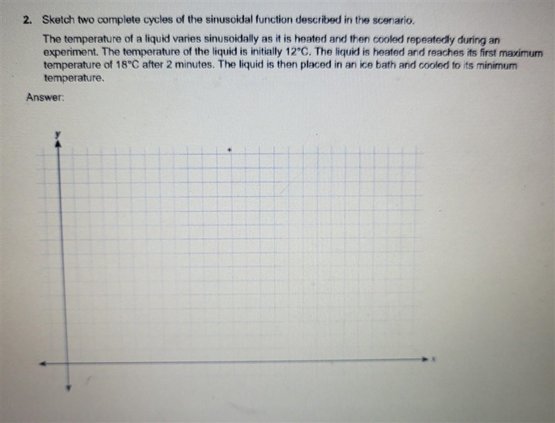 Sketch two cornplete cycles of the sinusoidal function described in the scenario. The temperature of a liquid varies sinusoidally as it is heated and then cooled repeatedly during an experiment. The temperature of the liquid is initially 12°C. The liquid is heated and reaches its first maximum temperature of 18°C after 2 minutes. The liquid is then placed in an ice bath and cooled to its minimum temperature.​