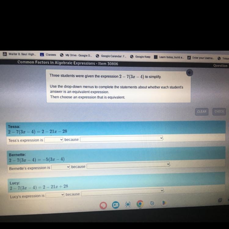 Bernette's expression is NOT equivalent because she did 2-7 first which is not correct. Since the -7 is connected to the parenthesis, she needs to fully distribute the -7 into the parenthesis before including the 2.