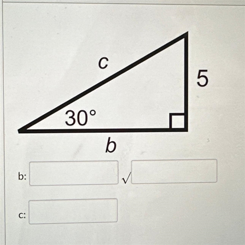 The long leg is the short leg times the sqrt3. So the long leg, b, is 5sqrt3.