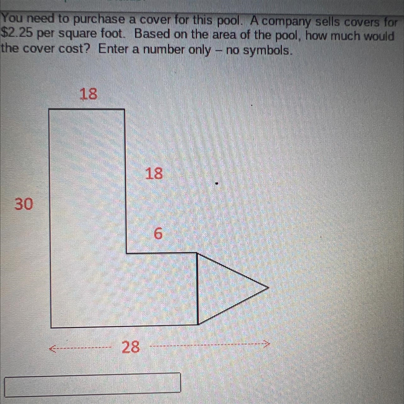 To calculate the cost of the cover, we need to know the area of the pool. Assuming that the pool is rectangular and has the dimensions given by the four numbers provided (30, 18, 18, 6), we can calculate the area as follows: