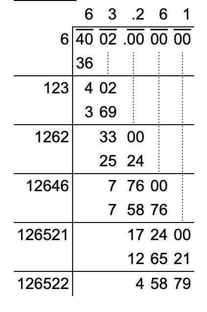 The second row of the attachment shows the divisor 12_, where 12 = 2×6, twice the root to that point. The largest digit 'a' that can fill the blank is 3, so the divisor used is 123, and the next subtraction is of (2·6·10 +3)·3 = 369.