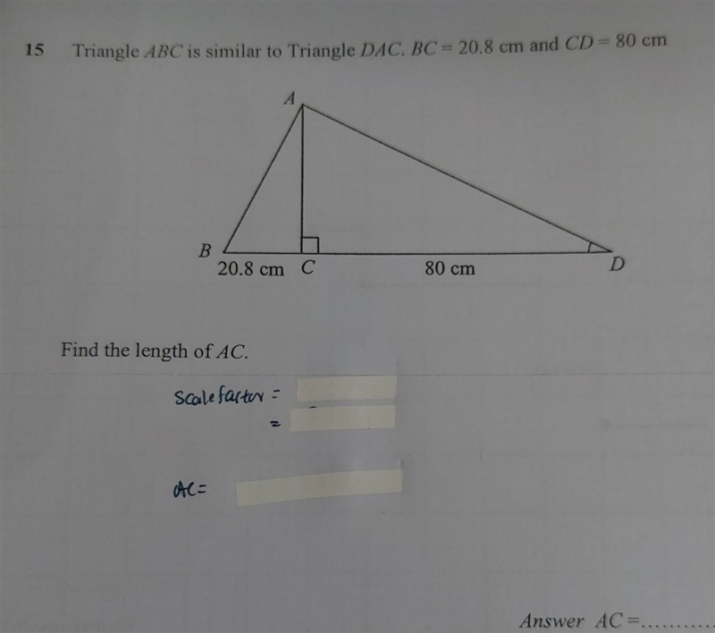 Triangle ABC is similar to Triangle DAC. BC = 20.8 cm and CD = 80 cm B Find the length of AC. A 20.8 cm C AC = Scale factor = 80 cm D