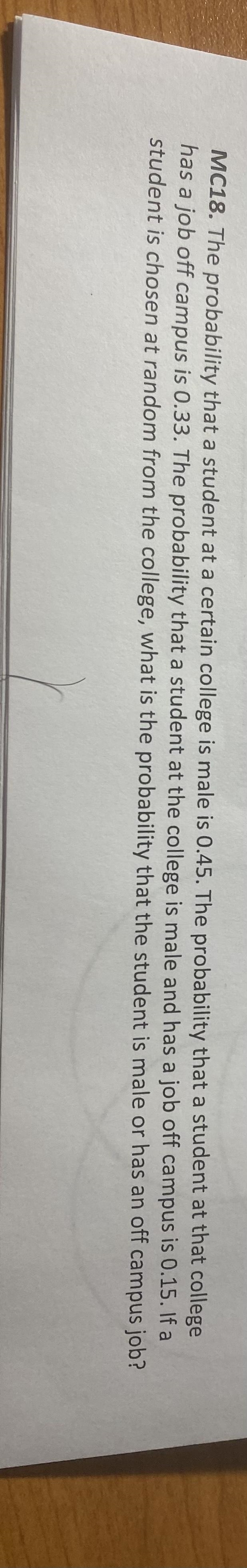 To do this, we add the probability of being male (0.45) to the probability of having an off-campus job (0.33). However, we need to be careful not to count the students who are both male and have an off-campus job twice. So, we subtract the probability of being male and having an off-campus job (0.15) once.