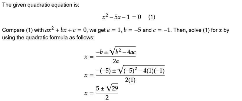 Therefore, the solutions to the equation x^2 - 5x - 1 = 0 are x = (5 + √29) / 2 and x = (5 - √29) / 2, which corresponds to option (a).