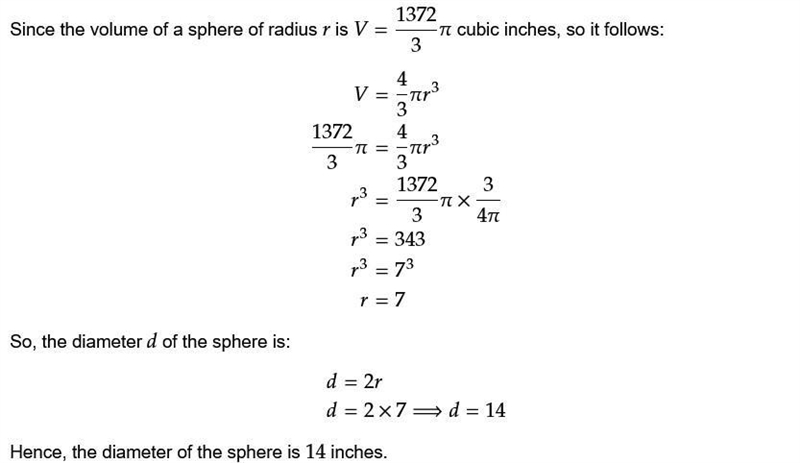 Please help me (The volume of a sphere is 1,372/3pi cubic inches. Find the diameter of the sphere, in inches.)