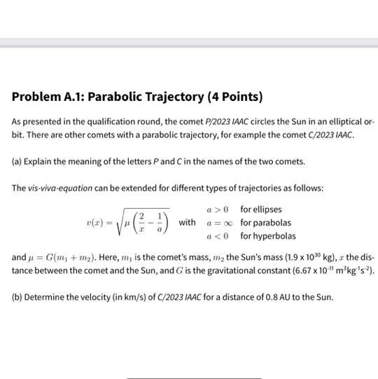 (b) To determine the velocity of comet c/2023 IAAC for a distance of 0.8 AU to the sun, we can use the Vis-Viva equation: