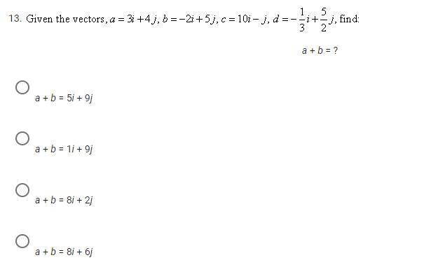 Given the vectors, a=3i+4j , b=-2i+5j, c=10i-j, d=-1/3i+5/2j, find : a+b=?