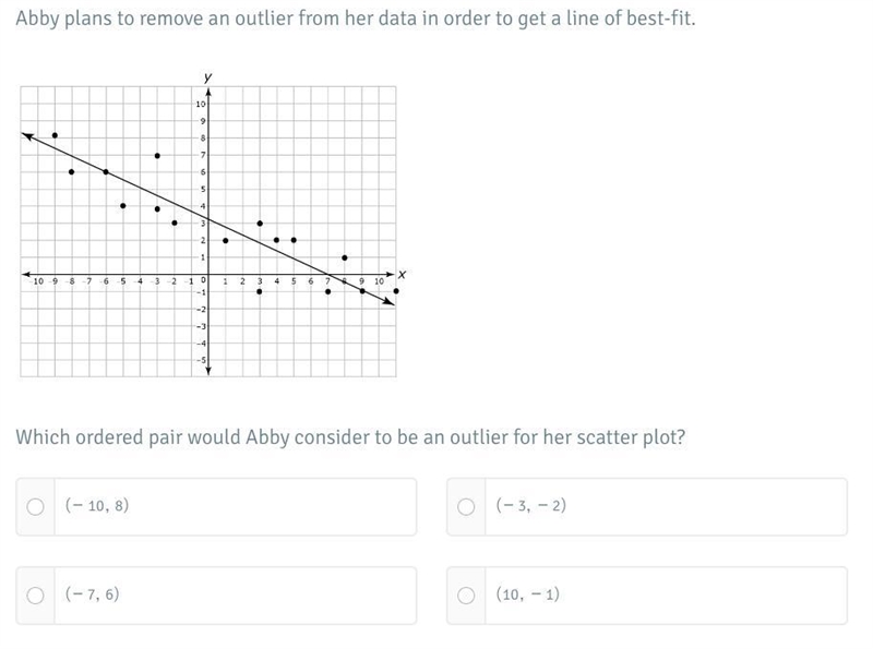 To determine which of the given ordered pairs would be considered an outlier for the given scatterplot, plot the ordered pairs and observe how far away they are from the line of best fit.