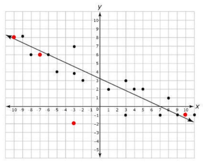After plotting the ordered pairs on the scatterplot (see attachment), we can see that point (-3, -2) is farthest away from the line of best fit. The other three points are very close to the line of best fit.