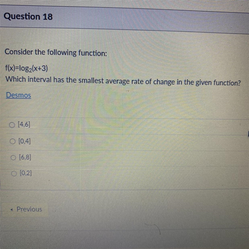 Consider the following function: f(x)=log2(×+3) Which interval has the smallest average rate of change in the given function?