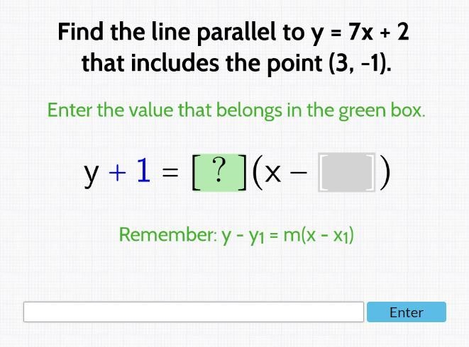 So, the equation of the line parallel to y = 7x + 2 and passing through the point (3, -1) is: