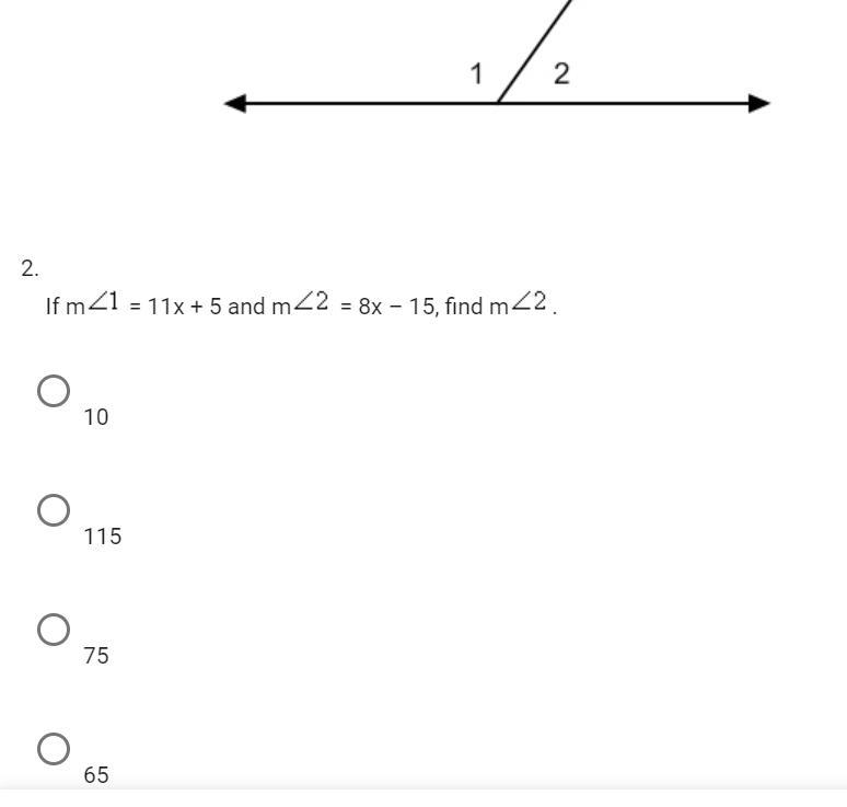 If m∠1 = 11×1 +5 and m∠2= 8x - 15 find m∠2