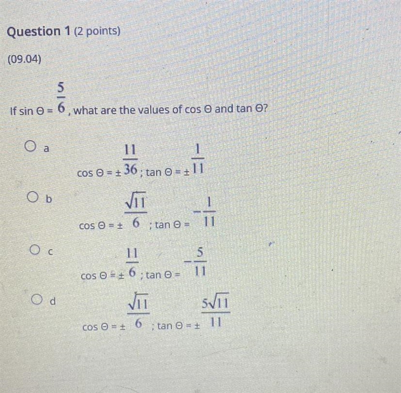 Therefore, if sin θ = 5/6, the values of cos θ and tan θ are: