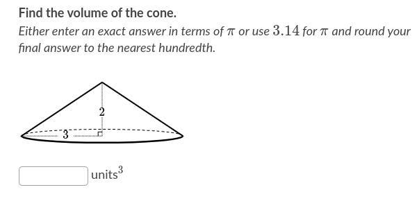 Find the volume of the cone. Either enter an exact answer in terms of π or use 3.14 for-example-1