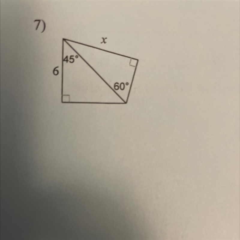 In an isosceles right triangle, the length of the hypotenuse is √2 times the length of a leg. So the length of the hypotenuse is 6√2, which is the length of the hypotenuse of the 30°-60°-90° triangle. In a 30°-60°-90° triangle, the length of the shorter leg is one-half the length of the hypotenuse, and the length of the longer leg is √3 times the length of the shorter leg. So the length of the shorter leg is 3√2, and it follows that x = 3√6.