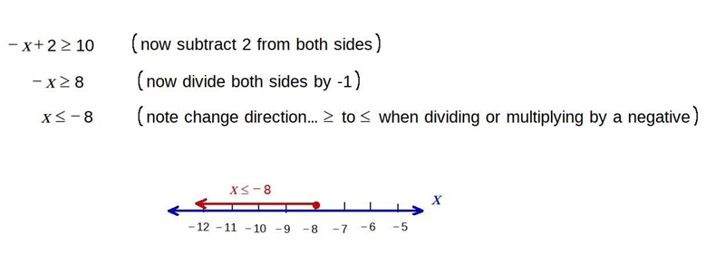 Which number line shows the solution to the inequality −x + 2 ≥ 10?