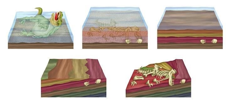 Petrified bones, imprints of leaves or footprints, and insects preserved in tree sap are all examples of fossils. Fossils are the preserved remains or traces of organisms that lived in the past. They can provide information about the evolution of life on Earth, as well as the environment in which these organisms lived.
