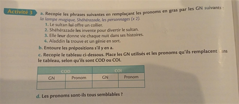 c. Recopie le tableau ci-dessous. Place les GN utilisés et les pronoms qu'ils remplacent dans le tableau, selon qu'ils sont COD ou COI.