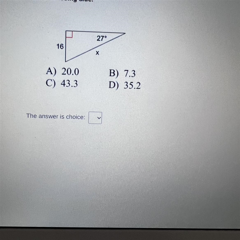 sin 27 = opposite / hypotenuse = 16/x = 0.45399049974.