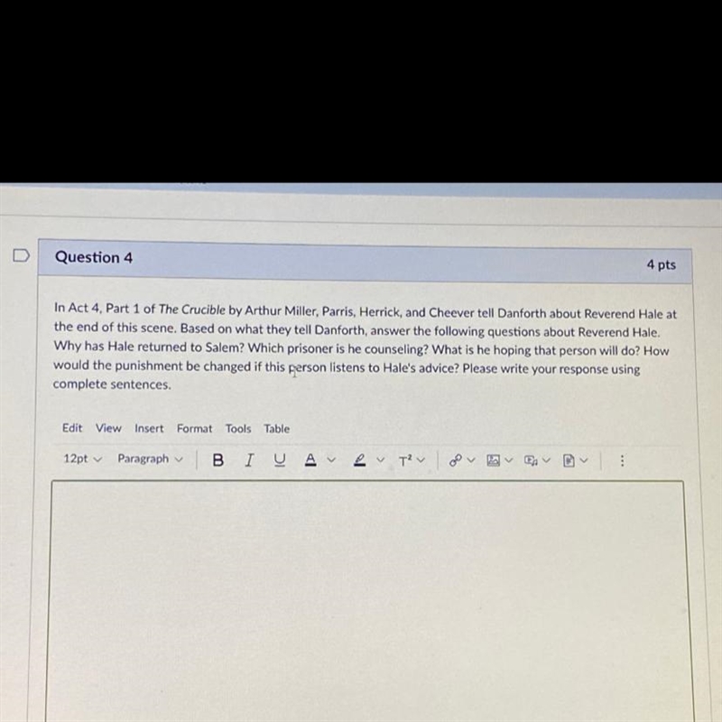 Reverend Hale has returned to Salem because he is having doubts about the witch trials. He has seen the harm that they have caused, and he is no longer convinced that all of the accused witches are guilty. He is counseling John Proctor, who has been accused of witchcraft. Hale is hoping that Proctor will confess to witchcraft, even though he is innocent. If Proctor confesses, he will be spared from hanging. However, if he does not confess, he will be executed.