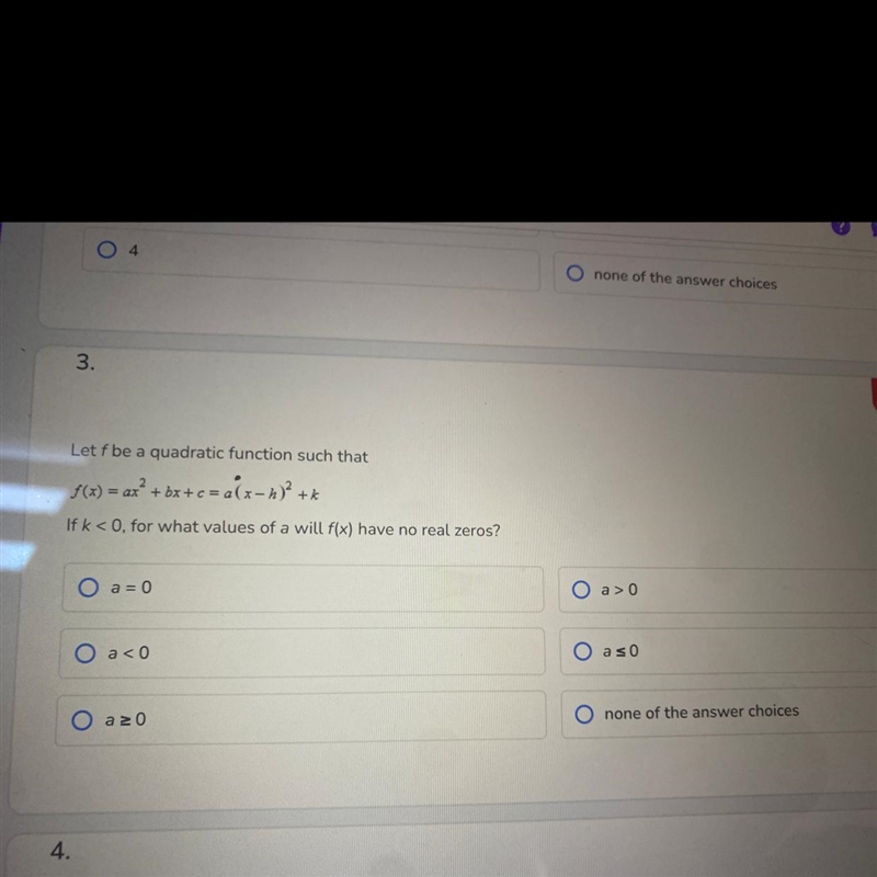 3:Let f be a quadratic function such that f(x) = ax² +bx+c = a (x-h)² + k If k < 0, for what values of a will f(x) have no real zeros? O a=0 O a<0 O azo 4. O a>0 O aso …