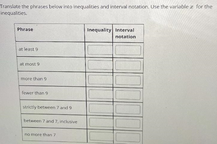 7<x<9 and (7,9) (This is the only one I'm unsure of. Strictly, not sure if it includes or doesn't include, usually it just says include or doesn't include)