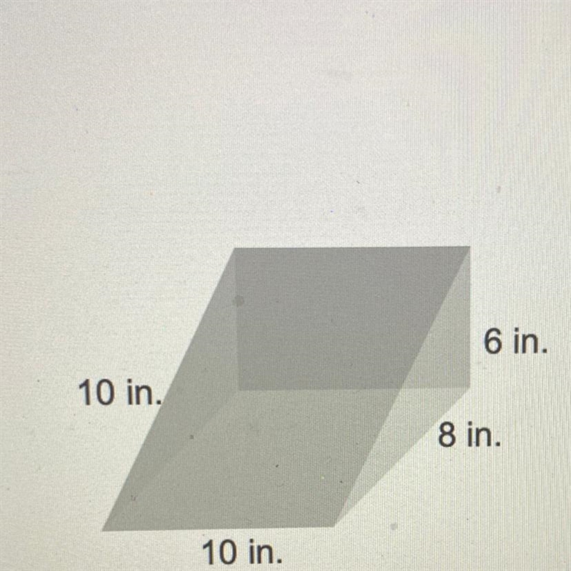 You want the lateral area of a triangular prism with triangular base having sides 6 in, 8 in, and 10 in, and a distance between them of 10 in.